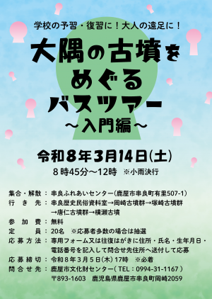 3/5〆切 3/14 大隅の古墳をめぐるバスツアー(入門編) 大隅の古墳をめぐるバスツアー(入門編)は、2026年3月14日(土曜日)午前8時45分~12時予定、集合・解散:串良ふれあいセンター(鹿屋市串良町有里507-1)で実施される。 大隅半島の古墳(岡崎古墳群・唐仁古墳群・塚崎古墳群・横瀬古墳)をめぐるバスツアーです。 古墳って何だろう?大隅に古墳があ… …続きを読む ▶