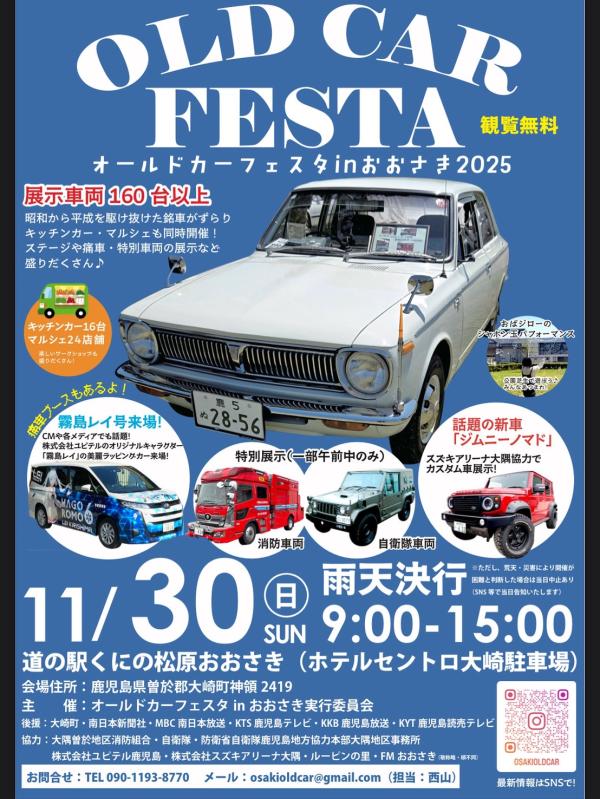 11/23 第47回くしら黒土祭り 大抽選会や野菜 牛肉販売など 第47回くしら黒土祭りは、2025年11月23日(日曜日)9時00分~14時30分、串良平和公園催物広場(鹿屋市串良町有里5183番地1)で開催される。主催者くしら黒土祭り実行委員会 太陽と大地の恵みをあなたに! 串良地域の4大祭りの1つで、地域に根ざした農業祭り「第47回くしら黒土祭り」 串良が… …続きを読む ▶