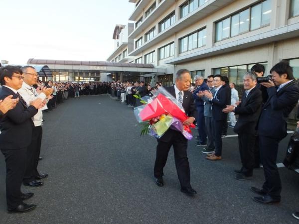 昼間の退任式では、これまでの思いがこみ上げ涙ぐむ場面も少しあったが、晴れ晴れとした表情で、職員らに惜しまれながら笑顔での退庁式となった。