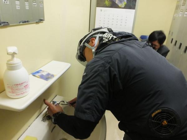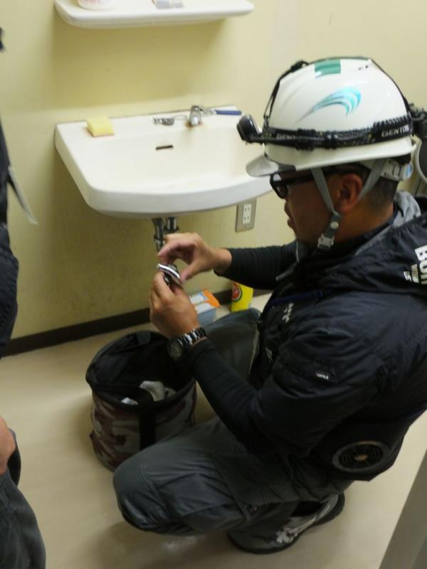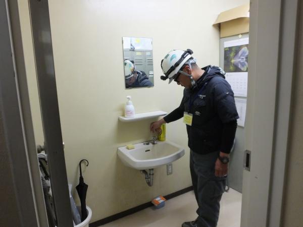 鹿屋市保健センターでは、トイレや手洗い、給水所などの水漏れ、水の出具合や異常個所、水量等を点検。キスコマの摩耗を確認し、早速交換の作業を行っていた。
