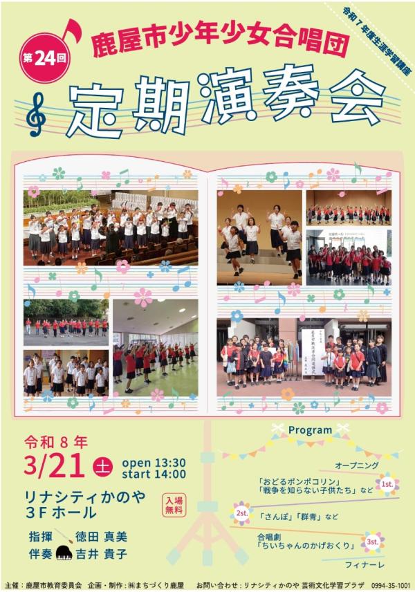 第24回 鹿屋市少年少女合唱団 定期演奏会は、令和8年3月21日(土) 開場13:30 開演14:00、リナシティかのや3Fホールで開催される。