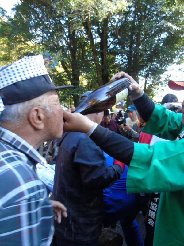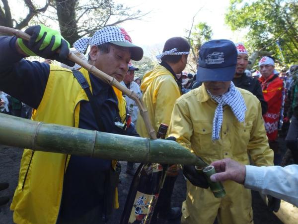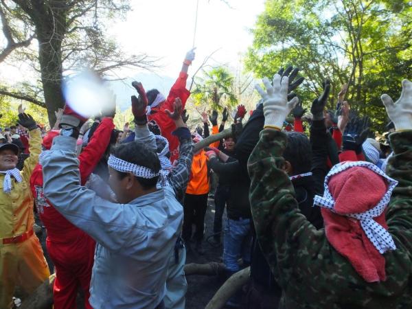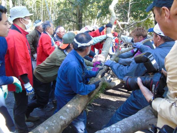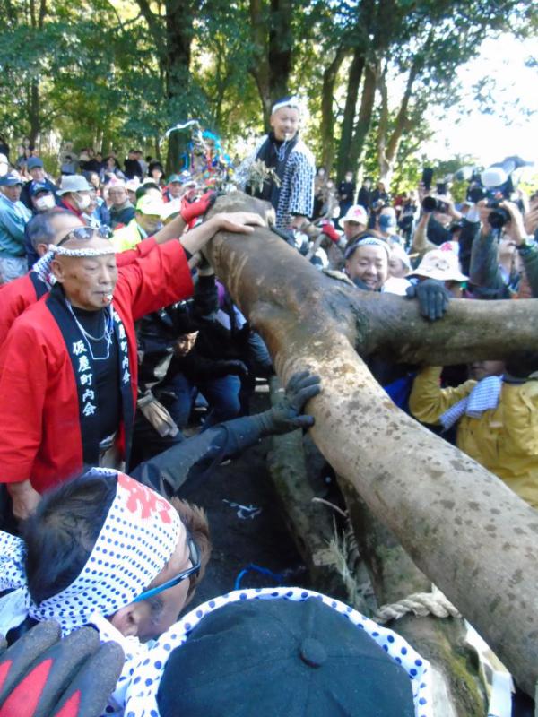 高隈地区の高隈町内会(上)と大黒町内会(下)が2つに分かれ、それぞれ山から切り出した大木を絡ませ、その瞬間までいろんな駆け引きが行われ、御神木に焼酎をかけ、引き手も焼酎を呑み気合を入れ、雄木と雌木が絡んだ瞬間から力強く引き合い熱戦が繰り広げられた。