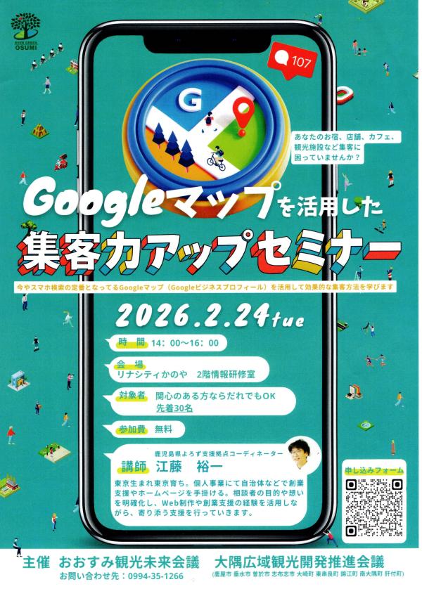 株式会社おおすみ観光未来会議では、大隅広域観光開発推進会議と連携し、来訪者を地域のランチ店や飲食店、土産物店、店舗、観光施設などへ効果的に誘導することを目的として、関係事業者等を対象に標記セミナーを開催します。