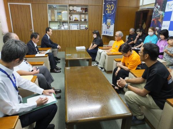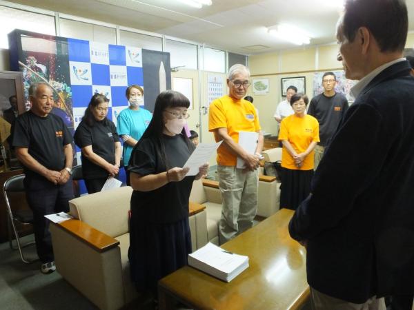 写真=柳川会長㊨から永野町長へ嘆願書が手渡される