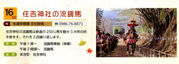 曽於市の住吉神社流鏑馬は、令和7年11月16日(日)、曽於市末吉町二之方の住吉神社で開催される。