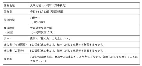 知事とのふれあい対話 大隅地域(大崎町・東串良町)は、令和8年1月12日(月・祝)、大崎町中央公民館で開催される。