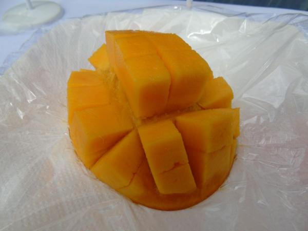 着色や糖度も良好とされる今年の完熟マンゴー試食も行われた。
