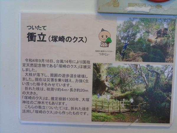塚崎のクスは、塚崎古墳群の第一号墳の上にご神木として聳え立っているが、最近の古墳調査発掘で4世紀代の古墳であることが分かり、優に1700年近く前の巨木だということになり、その枝が折れ、その一部といっても大木のため枝は、幹回り約4m、直径約1.3mと大きいもの。