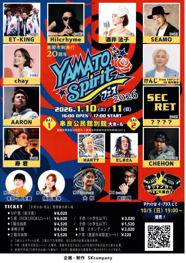 YAMATO spiritフェスは、2026年1月10日(土)DAY1、2026年1月11日(日)DAY2、串良公民館別館大ホールで開催される。