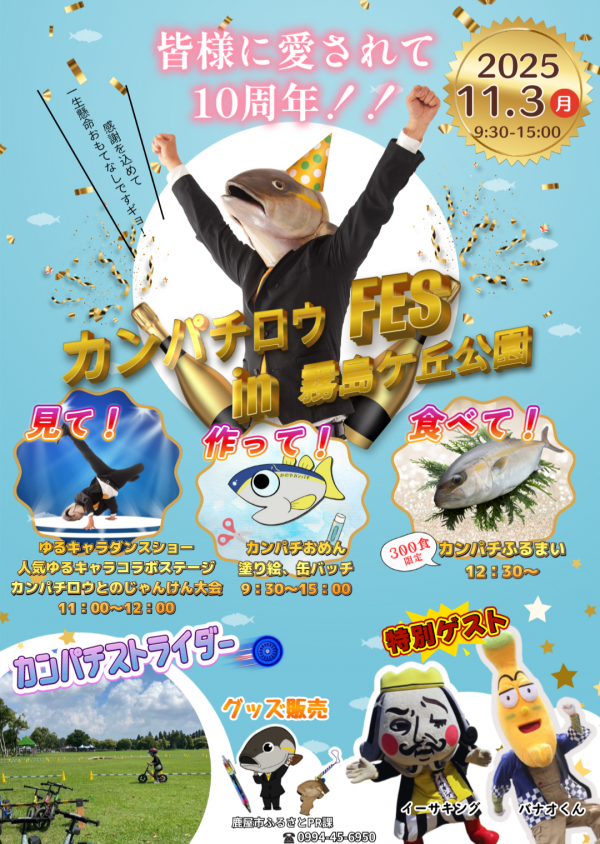 「かのやカンパチロウ」が誕生して10周年を迎えるにあたり、これまで応援していただいた皆様へ感謝の気持ちを込めて、記念イベント開催決定。