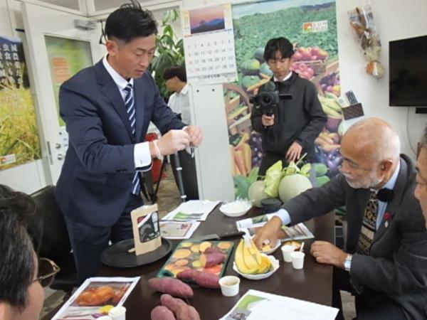 写真=サンフィールズの久木田社長が輝北メロンおり姫を説明