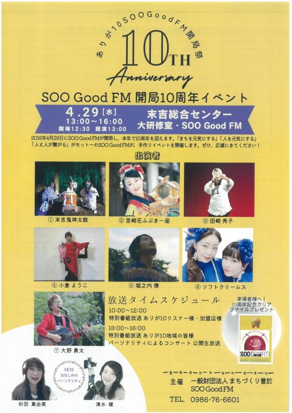 SOOGood FM 開局10周年イベントは、令和8年4月29日(水曜日)13:00〜16:00、開場12:30 開演13:00、曽於市末吉総合センター大研修室で開催される。