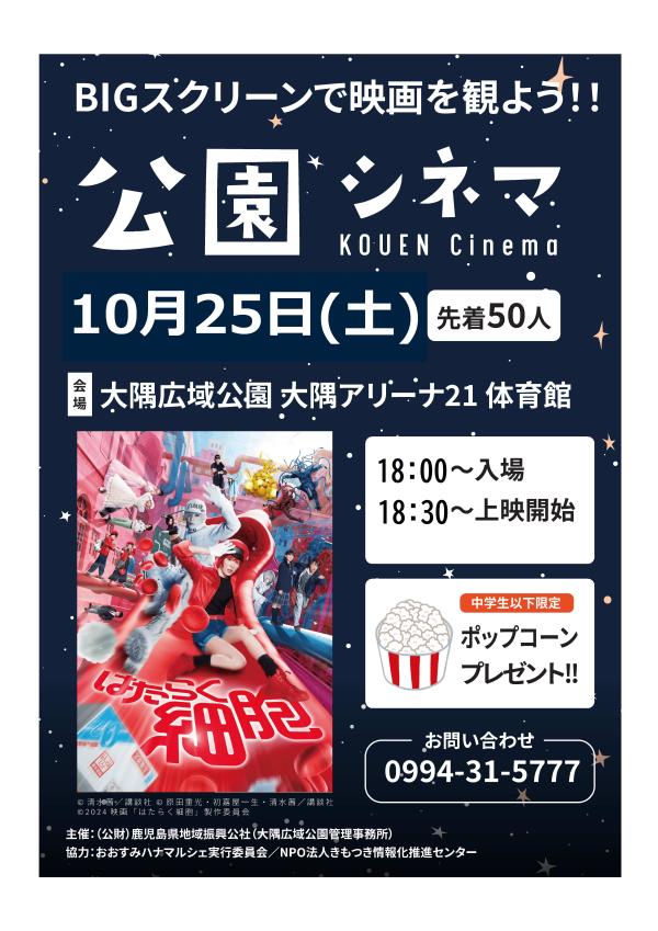 Bigスクリーンで映画を観よう! 公園シネマは、令和7年10月25日(土)18:30~、大隅広域公園大隅アリーナ21体育館で開催。