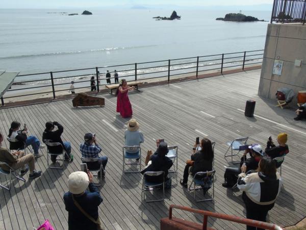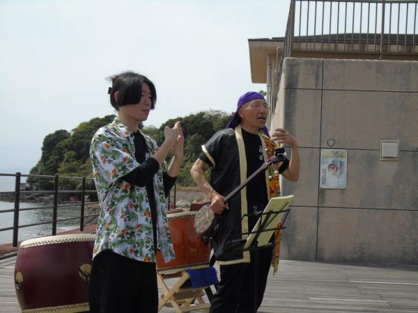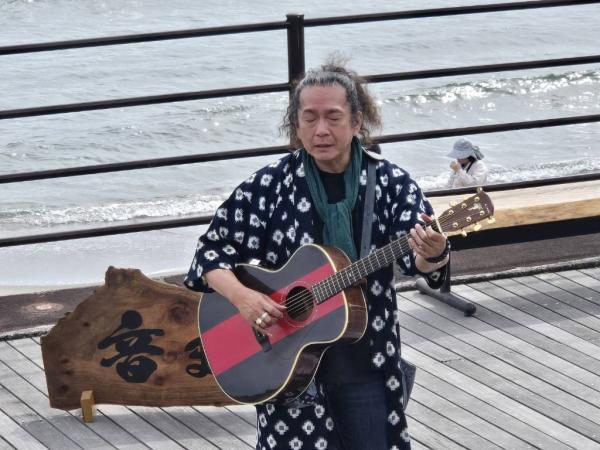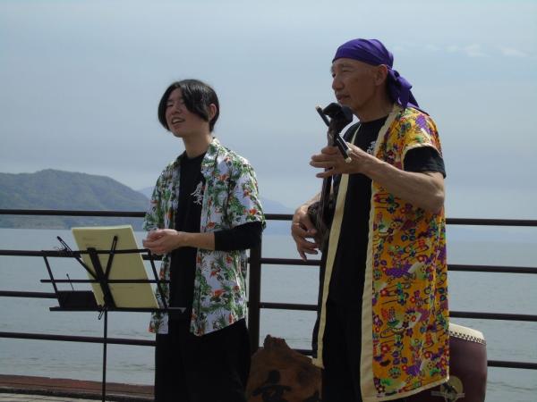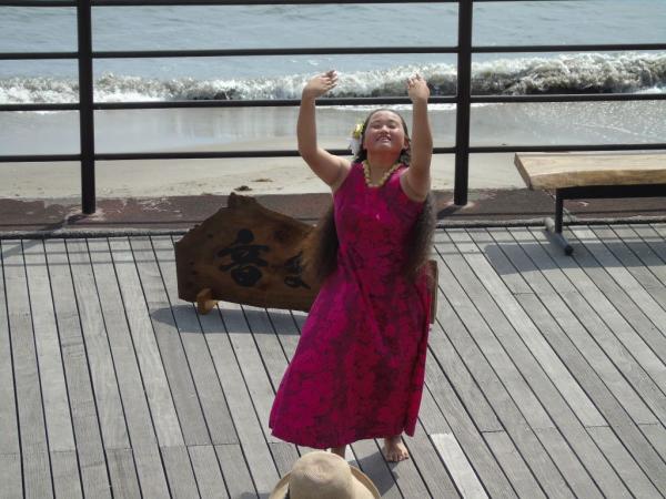 晴と曇りが交互に訪れる合間で天気に恵まれたこの日、波の音を聞きながらライブがあり、和太鼓演奏、毎日ライブを続けながら全国を巡っているシンガーソングライターのきよふみライブ、三線デュオ、フラダンスなど、それぞれジャンルの違う音楽が浜辺に流れた。