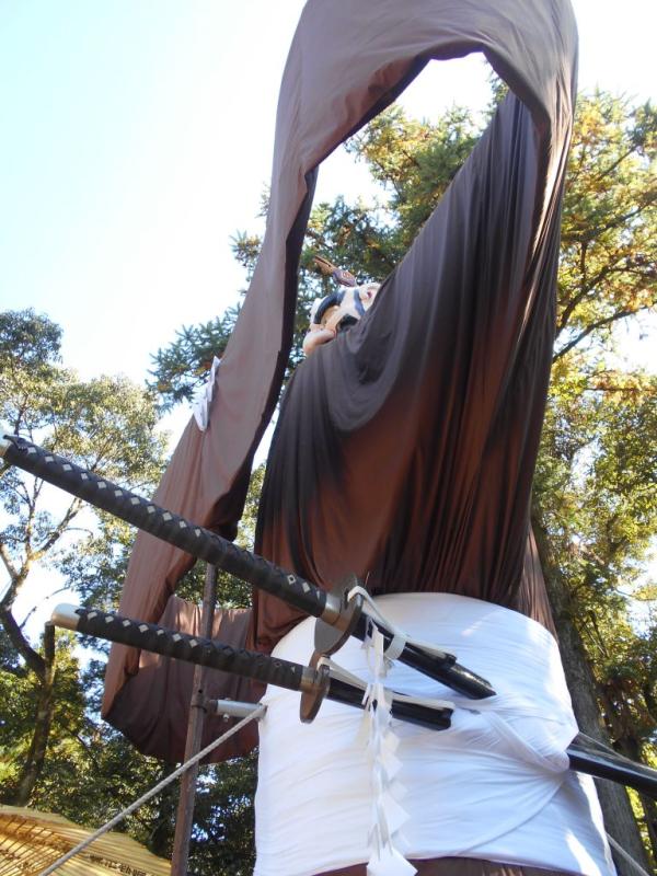 、「弥五郎どんが起きっどー」のふれ太鼓で弥五郎どんが目覚め、身支度をすっかりととのえた弥五郎どんが、岩川八幡神社の境内で網に引かれ、巨体がやおら身を起こす。