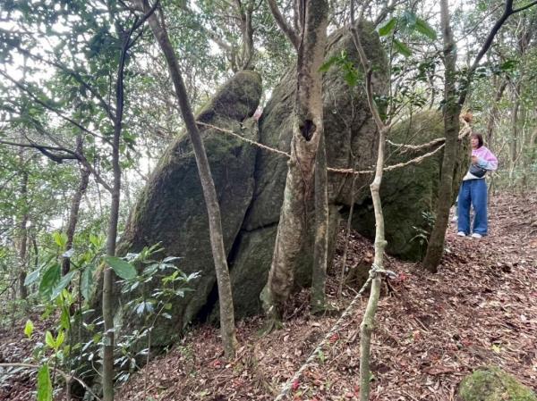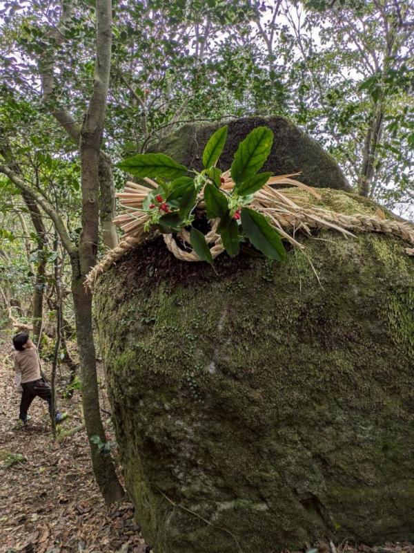 高屋山上陵近く神岩にまこもの注連縄奉納
