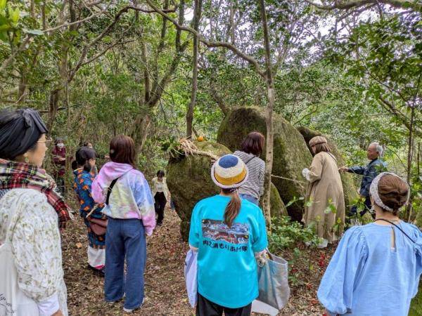また、そのメンバーが本宮でもある高屋山上陵跡にも度あるごとに参拝しており、途中の神岩と言われている岩に、朝市で作られた注連縄が奉納された。