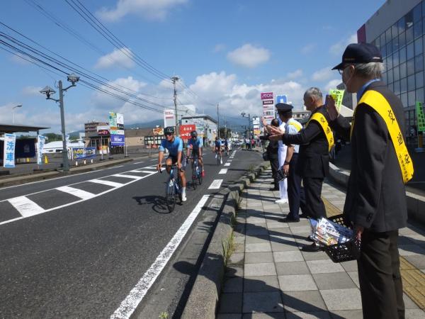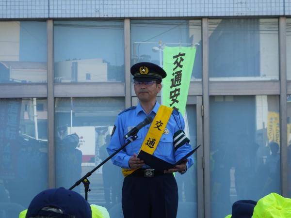 髙野信司鹿屋警察署長が最近の交通事故等の状況や秋の全国交通安全運動の内容を伝え、シエルブルー津留崚選手による交通ルール等や運動の重点項目説明があった。