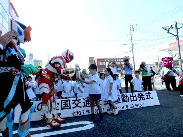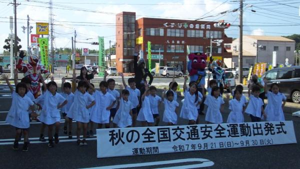 秋の全国交通安全運動出発式が、令和7年9月19日、イオンかのやショッピングセンター駐車場で開催され、鹿屋カトリック幼稚園園児らによるダンスや誓いの言葉の発表、交通パレードの実施、参加者による啓発物品配布等で交通安全の願いを届けた。