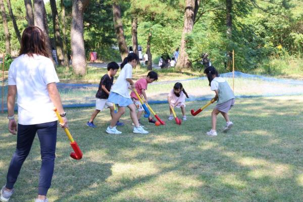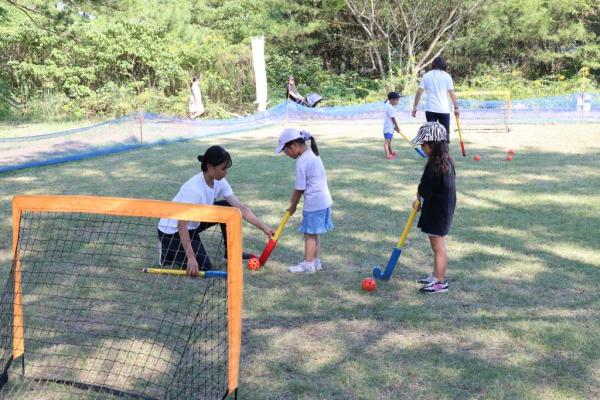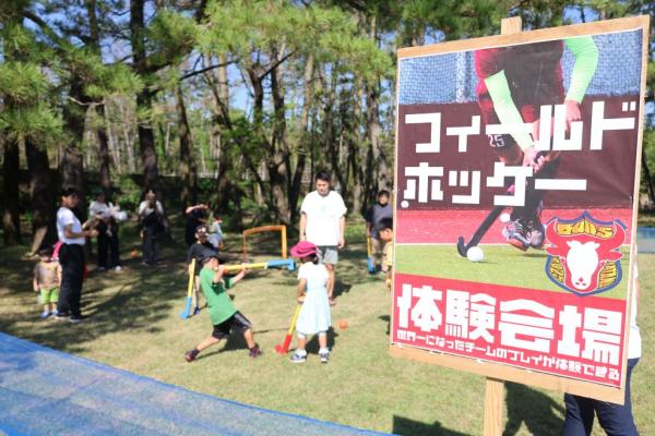 地元チームと一緒にスティック体験のフィールドホッケー KATANA Bulls 交流ブース。