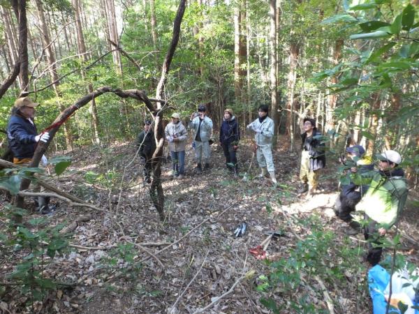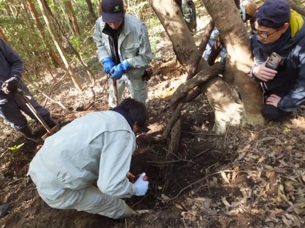 この日、鹿屋市串良町の廣久葛本舗に集合、普段見られない工場見学をしたあと、肝付町内之浦に移動し、田中敏郎さんらの指導により葛堀を体験した。