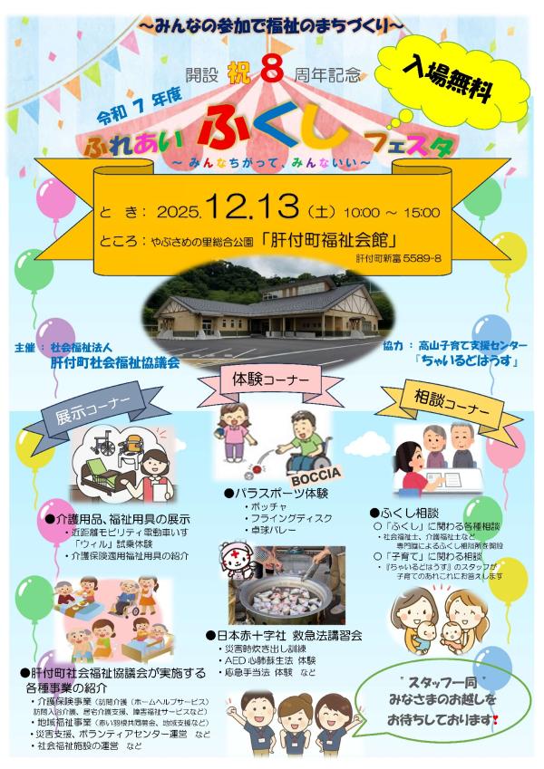 肝付町社会福祉協議会「ふれあいふくしフェスタ」は、令和7年12月13日(土) 午前9時30分受付、午前10時00分開会、午後3時00分閉会予定、肝付町福祉会館(肝付町新冨5589番地8・肝付町社会福祉協議会本所)で開催される。