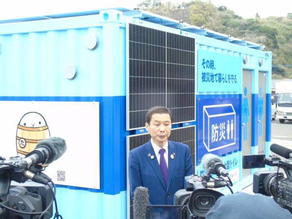 この防災用コンテナ型トイレは、災害時に移動して活用できる水循環式を採用した自己完結型水洗トイレ。防災道の駅として広域的な災害支援機能の強化を図っていく。