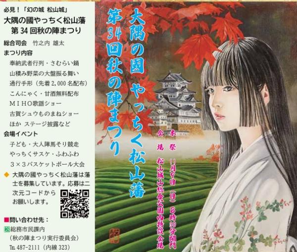 必見!「幻の城 松山城」大隅の國やっちく松山藩 第34回秋の陣まつりは、2025年11月9日(日)8時30分開門、松山城山総合公園内特設会場で開催される。