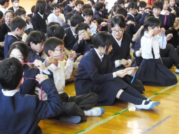 なるべくすばやく行うことで、ゴムが熱を持っていて、伸ばしたり縮めたりすることで感じることができる実験をみんなで行った。