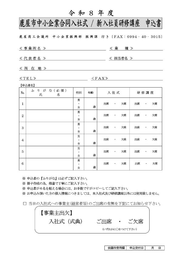 鹿屋商工会議所では、鹿屋市内の中小企業等に今春入社される新入社員の方々をお祝いし、激励するための『令和8年度鹿屋市中小企業合同入社式』を下記要領により開催致します。