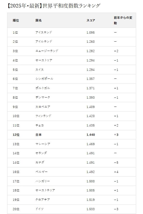 そして10年後の2025年の世界平和度指数ランキングでは日本は12位とランクダウンしている。ただ2024年は17位だったらしい。
