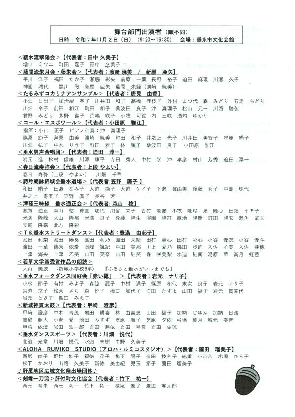 、垂水フォークダンス同好会「赤い靴」、第25回若草文学賞グランプリ朗読、詩吟朗詠錦城会垂水道場、T&垂水ストリートダンス、綾木流翠陽会、たるみず飛龍太鼓保存会、垂水吹奏楽団・垂水高校吹奏楽部、津軽三味線垂水通正会、肝属地区広域交流剣舞一刀流(肝付町文化協会)、春日流寿弥会、たるみずコカリナアンサンブル、垂水ダンススポーツ、藤間流朱月会、藤間流藤朱会、おわきまさやフューチヤリングたるみーず、たるみずYOSAKOI社中桜輝楽、フィナーレ垂水中央中学校吹奏楽部。