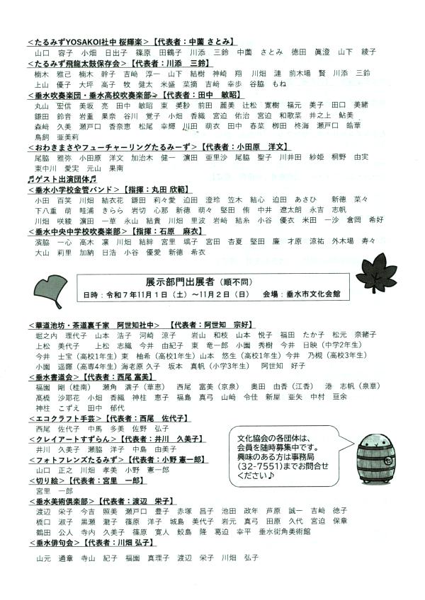 池坊阿世知社中、フォトフレンズたるみず、垂水書道会、垂水美術倶楽部、クレイアートすずらん、エコクラフト手芸、切り絵、垂水俳句会。