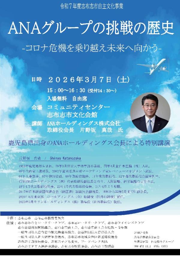ANAグループの挑戦の歴史~コロナ危機を乗り越え未来へ向かう~は、2026年3月7日 (土)15:00~16:30 (受付14:30~) 、コミュニテイセンター志布志市文化会館で開催される。