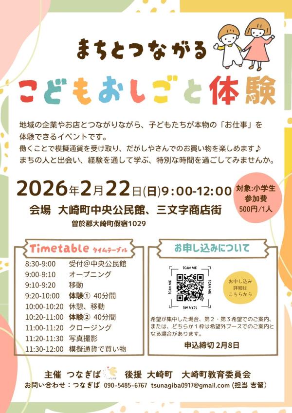 まちとつながる こどもおしごと体験は、2026年2月22日(日) 9時〜12時、大崎町中央公民館で開催される。