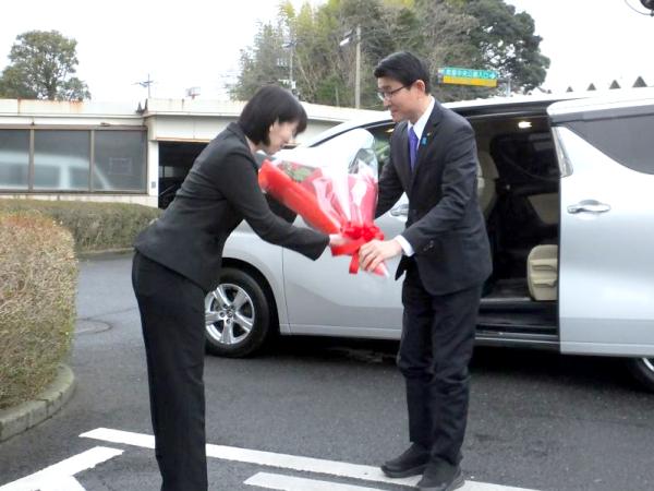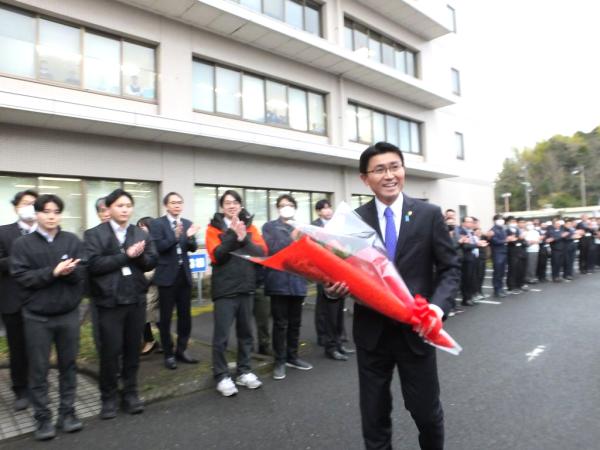 郷原新市長が車から降りてくると、まず「よろしくお願いします」と第一声があり、市職員から花束が贈られた。
