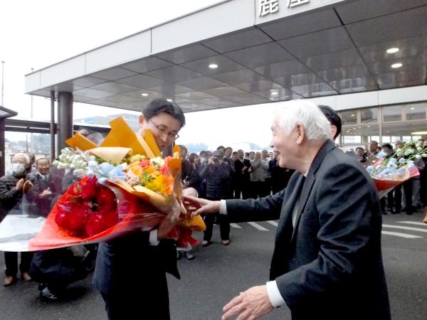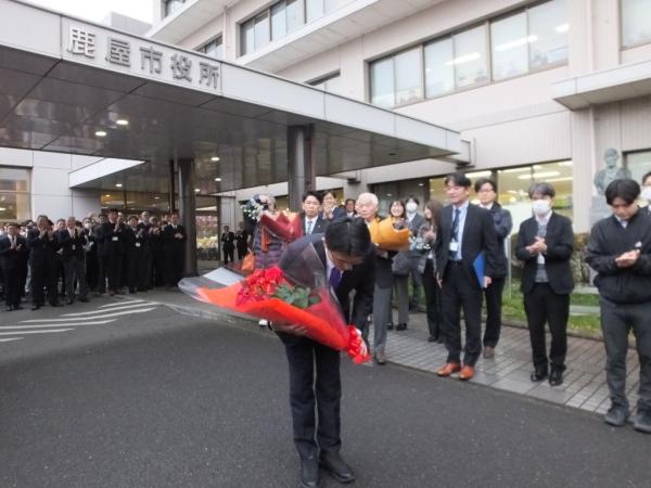 現職が勇退し新人4人で争った今回の鹿屋市長選で初当選した郷原拓男新市長の登庁式が、令和8年2月5日、市庁舎前で行われ、郷原氏の支持者ら市民と職員らが出迎え、花束が贈られ、新市長が深々と頭をさげあいさつ、郷原市政がスタートとなった。