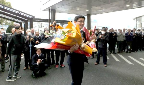 支持者や職員から花束 郷原拓男新市長の登庁式 鹿屋市