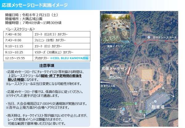 第4回JBCF鹿屋・肝付ロードレースは、令和8年2月21日(土曜日)に県立大隅広域公園周辺特設コースで開催されるが、同レース場で、特別応援企画「応援メッセージロード」企画参加者を募集している。