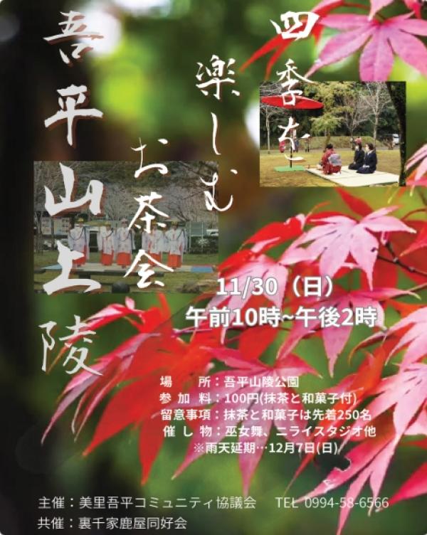 吾平山上陵の四季を楽しむお茶会は、令和7年11月30日(日)午前10時~午後2時、吾平山上陵公園で開催される。