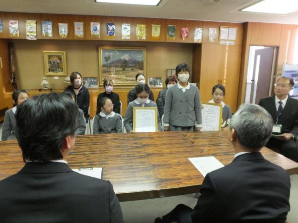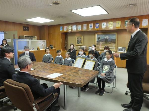 令和8年2月7日(土)の大会出場を前に、演奏した児童6名が教育長に表敬訪問を行ったもの。