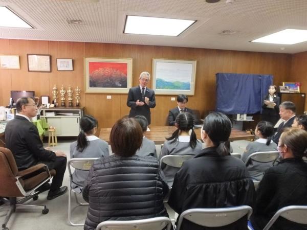 中野健作教育長が「なかなか慣れないうちは大変だったと思いますが、上手になっていけば楽しみになる、そうした大変さを乗り越えて今がある。一生のうちの宝物でもあり、九州大会では思いっきり活躍し悔いのないように頑張ってください。」と激励した。