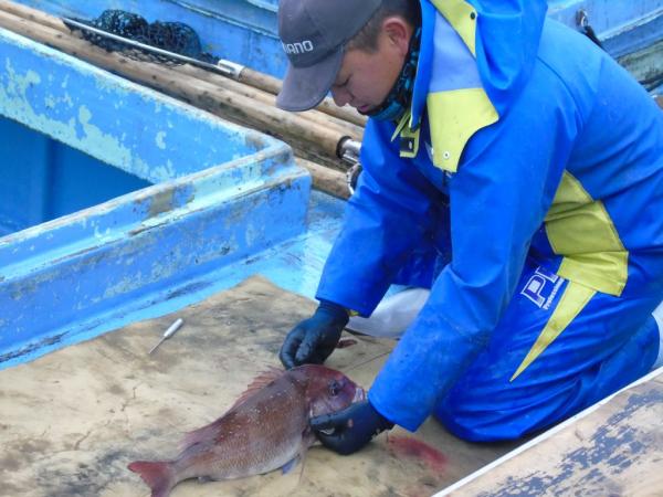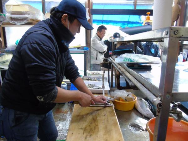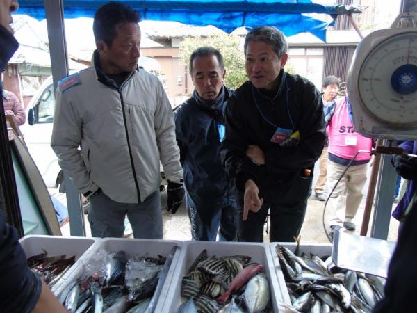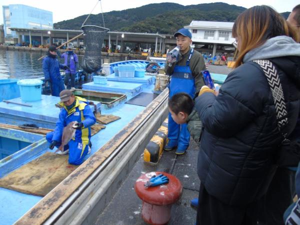 参加者は、まず漁港で定置網漁でとれた魚の仕分けの様子を見学し、漁師さんらの説明を聞きながら、船の上で魚の神経をまひさせ鮮度を長く保つ神経締めの作業などを見学した。