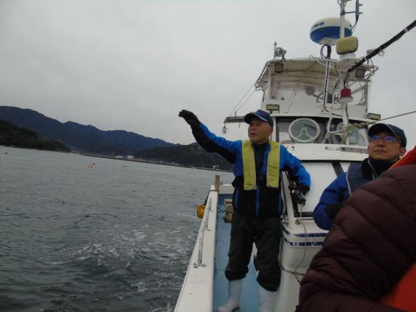 次に宝盛丸に乗って30分ほど内之浦湾内をクルージング、名物船長、津代美佐男さんによるガイド、内之浦湾の豊かさは港近く山に囲まれ川をつたい流れてくる豊富な水にあるなどの話に熱心に聞き入っていた。
