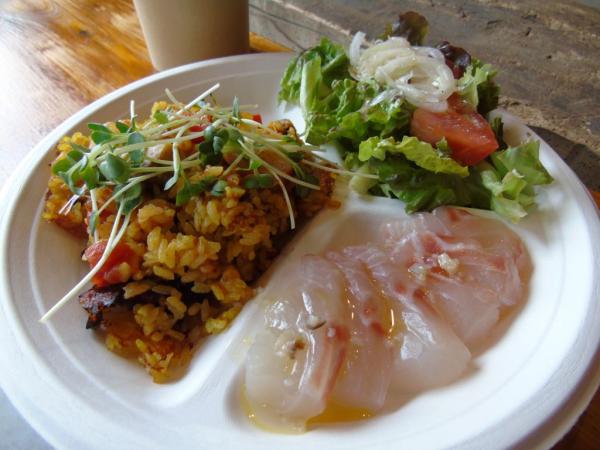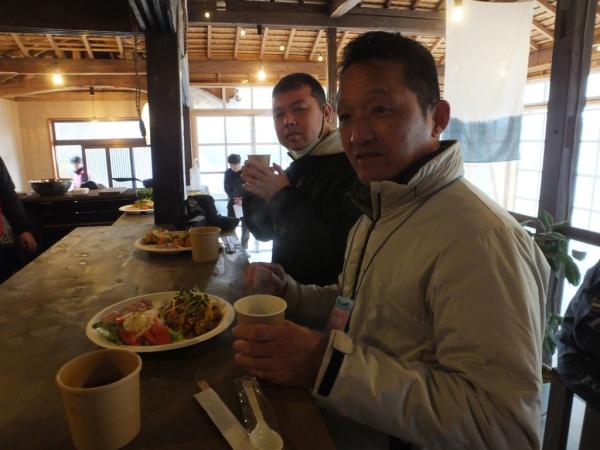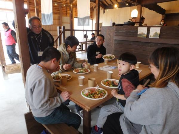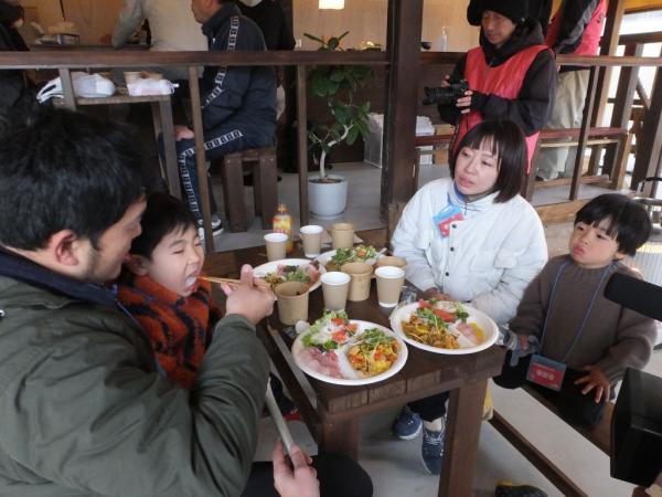 昼食では定置網漁でとれたメジナを使ったスープやカルパッチョ、アンチョビサラダ、市場にはあまり出回っていない未利用魚(ロコフィッシュ)のアカシュモクザメを使ったパエリアなどが振る舞われ、珍しい魚などの説明を、昌徳丸の柳川拓哉さんから聞きながら、美味しそうに食べていた。