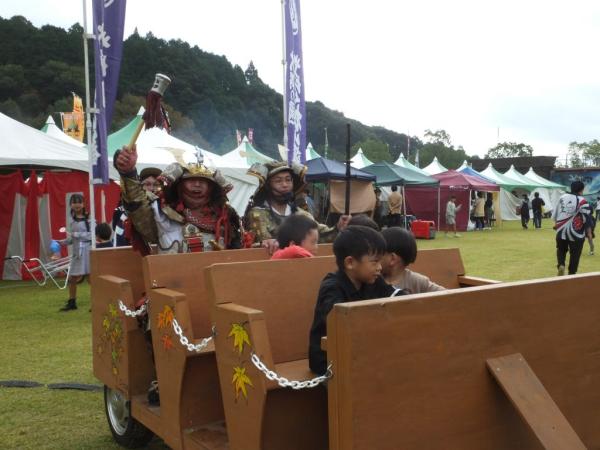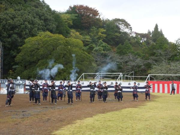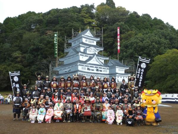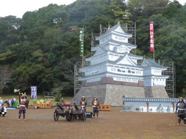 開門のあと迫力ある奉納武者行列があり、まつりの期間だけ見ることができる「幻の一夜城」をバックに大砲と鉄砲による号砲で祭りがスタート。