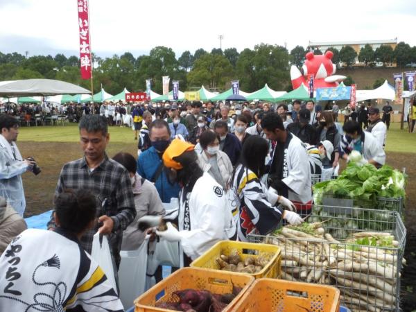 広い会場をぐるりと回るほどの大行列ができた山積み野菜の大判振る舞い。さむらい鍋、こんにゃく・甘酒無料配布。