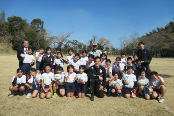 令和8年1月から鹿屋市内小学校授業において、桑水流氏と連携してタグラグビー指導を行っている鹿屋市ラグビーフットボール協会の中(あたり)裕則会長らが訪れたもの。