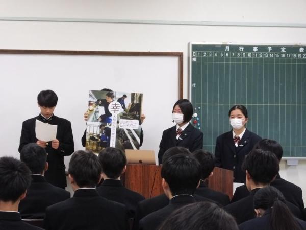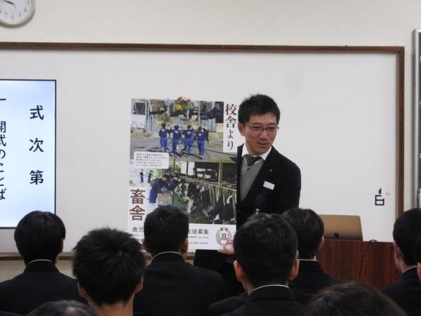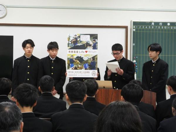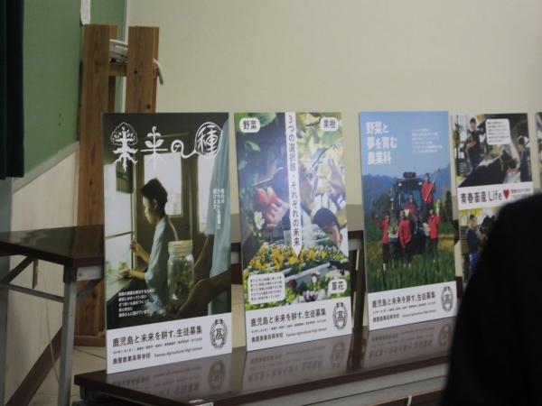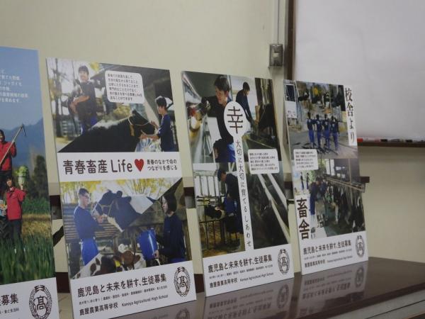 この日は、事業概要について説明があり、農業科2年、園芸科2年、畜産科2年の計28人が6チームで、それぞれの実習風景や生産物を題材にした.農業高校の魅力をポスターを通じて発表し、県教育庁高校教育課の西垂水武指導主事による講評もあった。