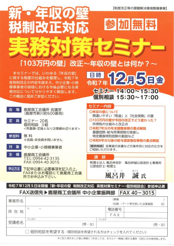 12/5 新・年収の壁 税制改正対応 実務対策セミナー 新・年収の壁 税制改正対応 実務対策セミナーは、令和7年12月5日(金)、セミナー14:00~15:30、個別相談15:30~17:00、鹿屋商工会議所会議室で開催される。 定員セミナー20名、個別相談3組 参加料無料 ※会員・非会員を問いません 対象者 中小企業・小規模事業者「103 万円の壁」… …続きを読む ▶